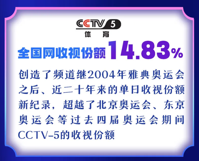 近日,CCTV-5全国网收视份额14.83%,环比前一日提升18%,创造了频道继2004年雅典奥运会之后、近二十年来的单日收视份额新纪录,超越了北京奥运会、东京奥运会等过去四届奥运会期间CCTV-5的收视份额。当日,CCTV-5中心城市收视份额达16.04%,环比前一日提升22%,创2009年以来单日收视份额最高纪录。双网收视份额均位居上星频道第1。
