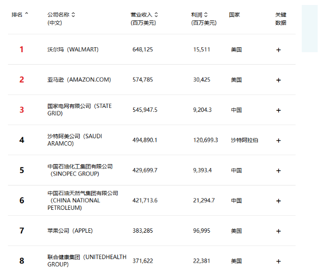所有上榜公司的净利润总和同比增长2.3%,约为2.97万亿美元。其中,沃尔玛连续第十一年成为全球最大公司。亚马逊重回第二。中国的国家电网公司继续位列第三。排在第四和第五位的分别是沙特阿美和中国石化。