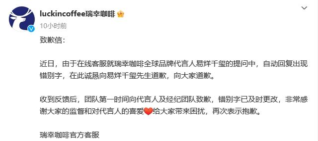 瑞幸在致歉信中称,由于在线客服就瑞幸咖啡全球品牌代言人易烊千玺的提问中,自动回复出现错别字,错别字已及时更改。