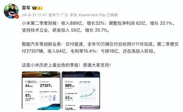 21日,雷军发文表示,小米第二季度财报:收入889亿,增长32%;调整后净利润62亿,增长20.1%。坚持技术立业,研发投入55亿,增长 20.7%。他在文中称,智能汽车等创新业务:交付提速,全年10万辆交付目标预计11月完成。第二季度交付27307辆,收入64亿,毛利率15.4%;亏损18亿,还在高投入阶段。