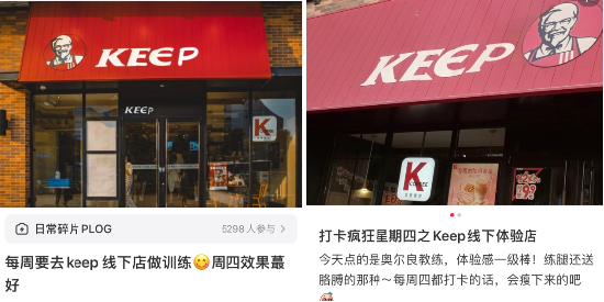 “每周去一次Keep线下店”,这样的文案配合着用户打卡肯德基门店的照片,已经成为健身圈流传甚广的经典“内部梗”。诚然,健身用户在锻炼时常常会出现这样的反向行为,“一不小心就吃上了放纵餐”,最后只好用这样的玩梗来表达自我。