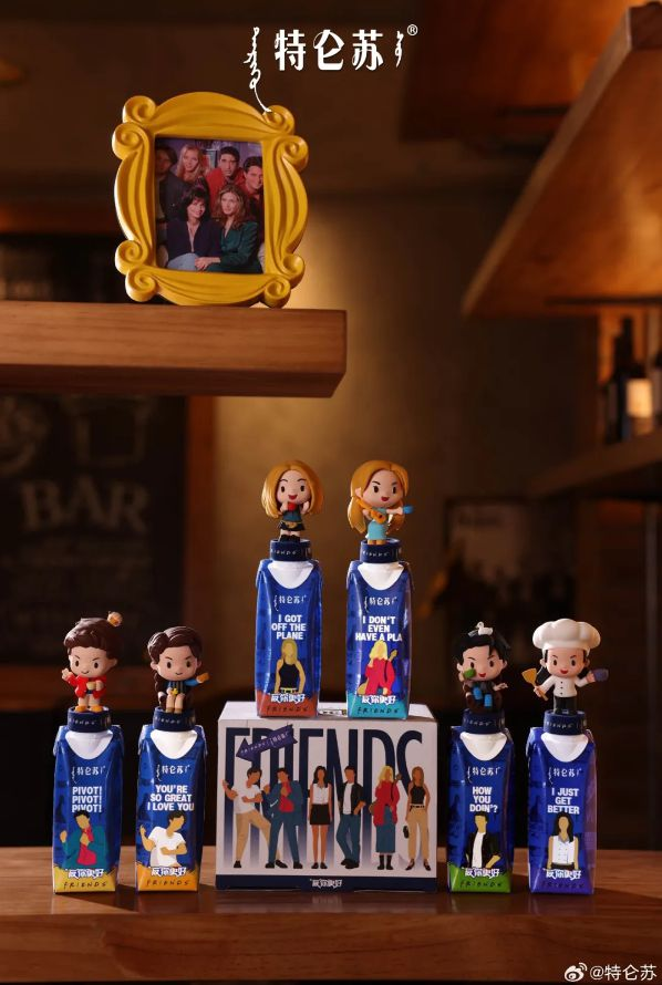 特仑苏联名8090共同的回忆——老友记IP,在开播30周年之际推出限定款牛奶、纪念卡及限定人偶瓶盖周边,利用对《老友记》剧情与场景的二次转换,唤醒IP粉丝的关注度。