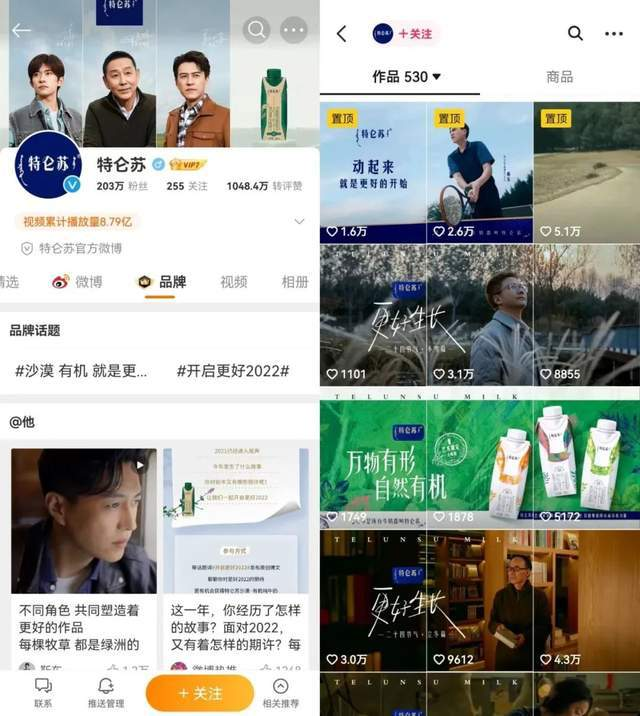 在娱乐讯息、公共讨论为主打的微博,特仑苏围绕明星代言,话题互动做传播,在保持高级品牌调性的同时,创作符合平台特性的内容;抖音官方账号保持调性,做价值观的传递,用KOL做种草,赋予产品情感附加值。