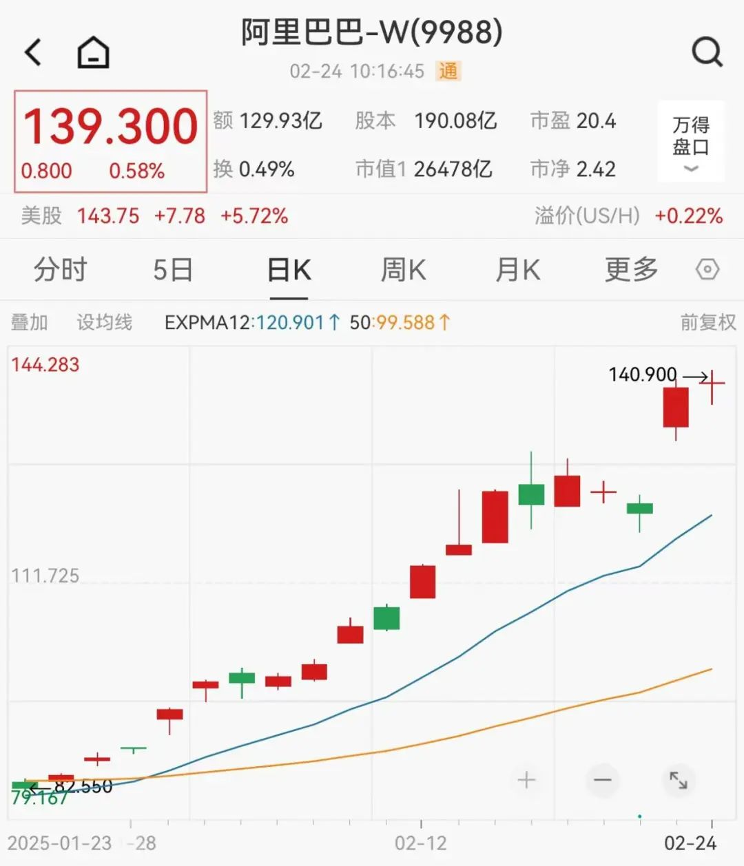 受利好消息刺激,阿里巴巴港股早盘短线拉涨,盘中涨超1%,最高报140.90港元/股。截至发稿,略有回调,报139.30港元/股。