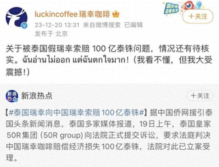 当年12月19日,泰国皇家50R集团向法院正式提交诉讼,要求法庭判决中国瑞幸咖啡赔偿经济损失100亿泰铢(约合人民币20亿元),泰国有关法院已立案受理。