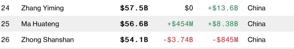 同时,彭博亿万富豪榜也显示,张一鸣登顶中国首富,身家为575亿美元(约合人民币4179亿元),位居全球富豪榜第24位,马化腾和钟睒睒分列第25和26位。