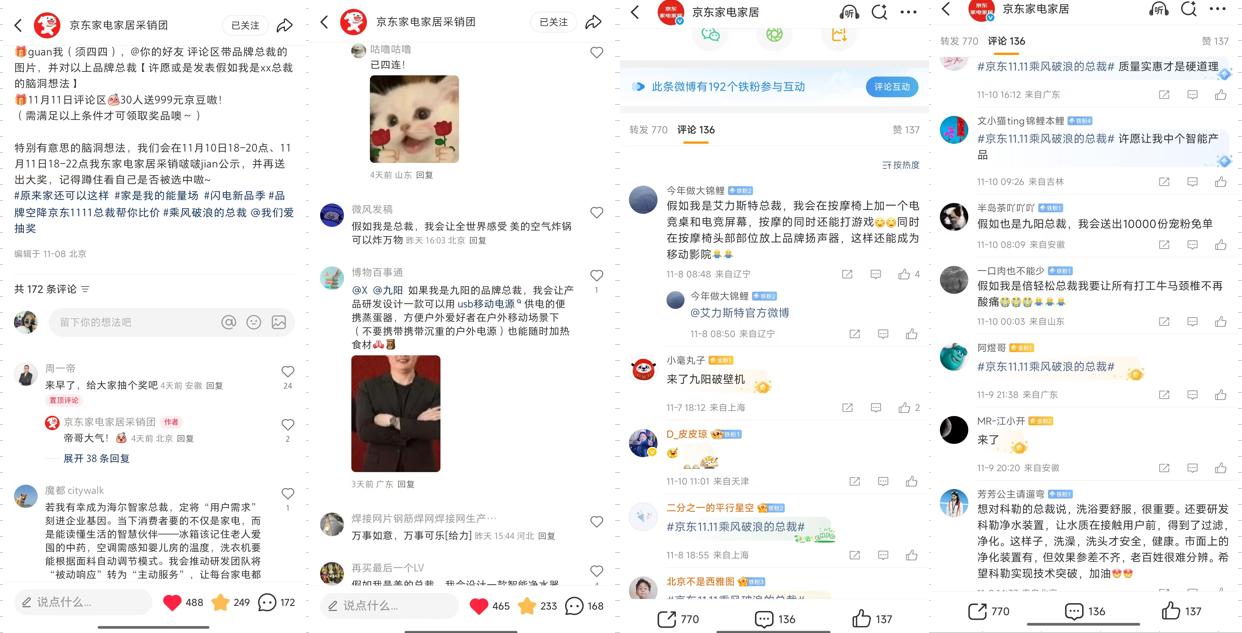 在社交传播层面,京东家电家居在微博、小红书等平台发起#假如我是xx品牌总裁#、#京东11.11乘风破浪的总裁#等话题互动,成功激活用户的共创热情。相关话题总阅读量达3.9亿,讨论量6万,吸引超30位百万至千万量级KOL参与内容共创,总互动量近430万。