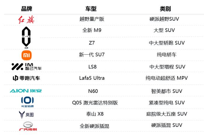 硬派越野(方盒子)赛道:红旗首款硬派越野量产版、哈弗猛龙PLUS、坦克800、方程豹钛7、广汽传祺T75、长城H10等集体亮相。“方盒子”造型+插混/纯电动力+激光雷达的组合,让越野从小众走向科技豪华。新能源方盒子SUV市场已全面进入红海阶段,各尺寸各价位全线覆盖。