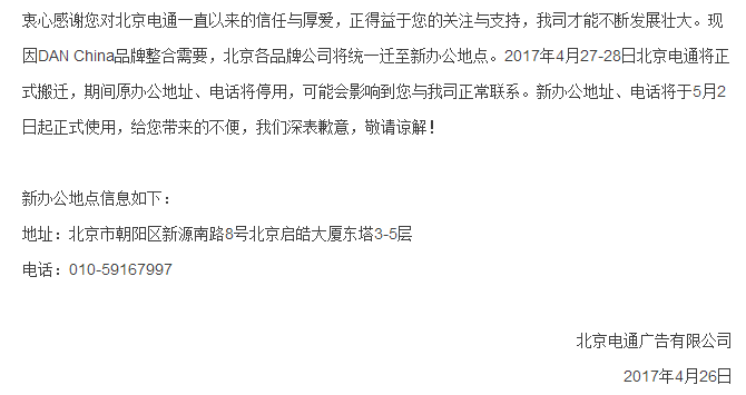 将迁入新的办公地点。但具体办公地址、电话等将于