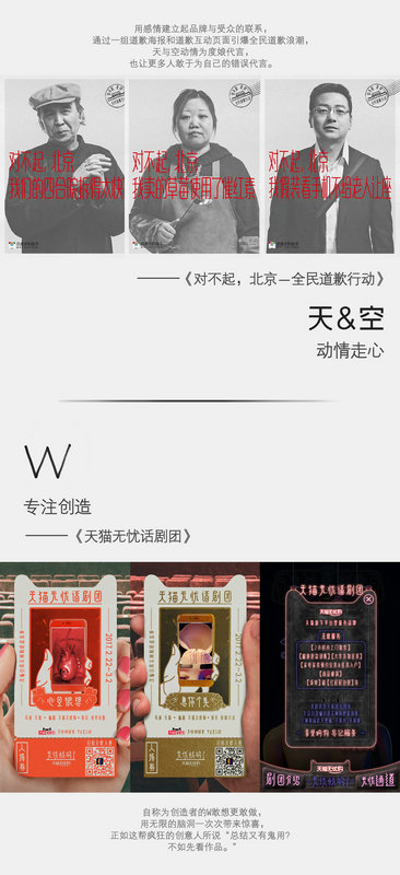 2015年天与空为百度手机助手先发起“对不起,北京-全民道歉行动”,因其巨大的反响迅速从北京扩展至全国各大城市。国人向来不喜欢认错,却擅长用各种理由掩饰错误,但反而是这种心理才使得更多人对“道歉”有所共鸣。、