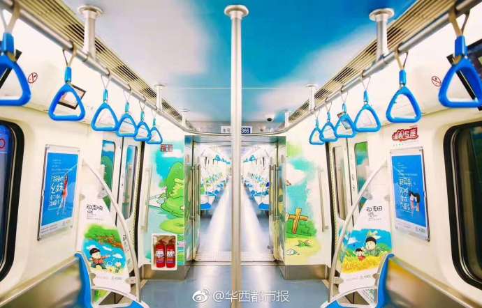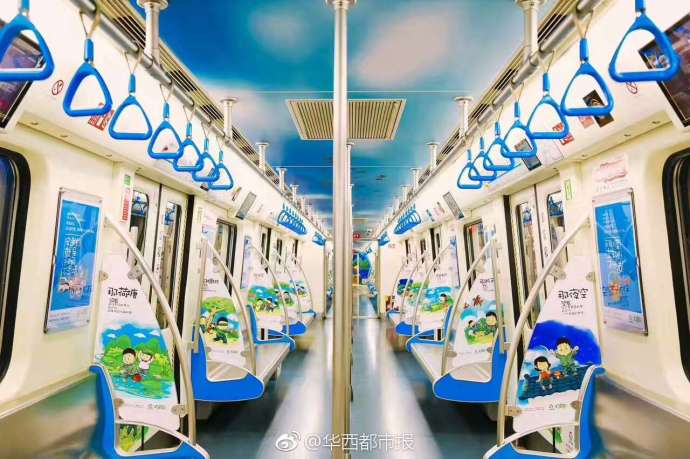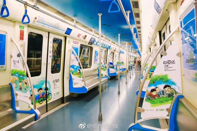 走进环保专列,抓蛐蛐儿、放风筝、寻找萤火虫、数星星……那些记忆中玩耍嬉笑的场景,蔚蓝的天空,清澈的河流,丰收的大地……这些童年的记忆变成了插画,车门上、挡板上、连接处,到处都是儿时的气息。而川剧变脸、熊猫、盖碗茶、耙耳朵等四川元素则变成了与环保紧密相关、生动有趣的车厢海报,引得上车的乘客一边赞叹,一边开启了自拍模式。