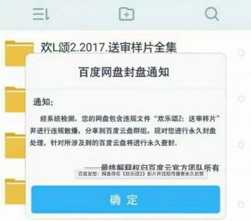百度通过系统检测,对《欢乐颂2》送审样片的文件均视为违规文件,一旦用户进行违规散播,分享到百度云盘群组,百度网盘官方将对用户进行永久查封。