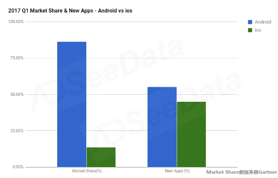 据2017年第一季度智能手机追踪报告显示,Android与iOS全球份额差距正越拉越大,Android市场份额已经接近iOS的6倍;但据AdSeeData监测,同一时间段iOS与Android在Facebook每日新增推广应用的数量差距则不大,也表明广告主对于高利润的iOS用户的获取争夺激烈。