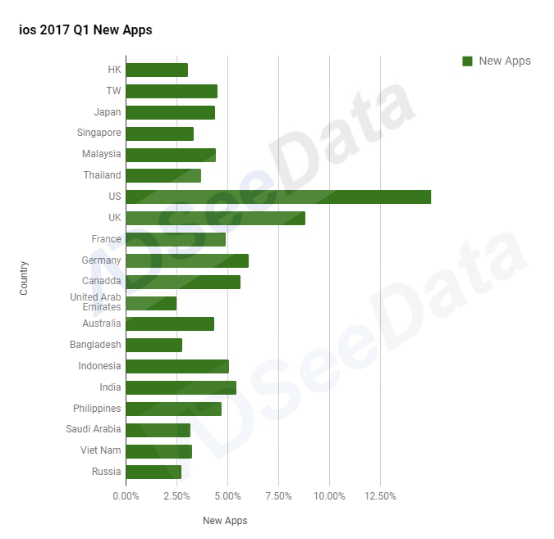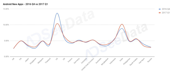 当然,这与印度新兴市场的逐步崛起有关。2016年第四季度,印度与美国之间的市场占有率仍然有接近5%的差距,在最新的一个季度里,两者的差距已缩减至0.2%。可见印度正式步入移动应用时代,并成为仅