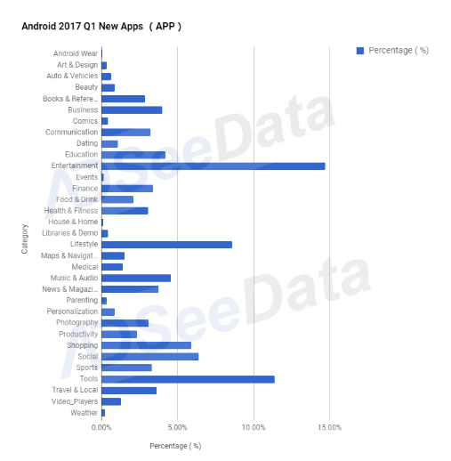 此外,排在二、三位的工具类和生活类应用的市场占比也环比2016年Q4季度有所下降,尤其是生活类应用,降幅超过3.0%。但功能性更具体的音乐音频、摄影、商务办公类的应用环比上一季度却出现了小范围的涨幅。