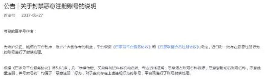 据网友爆料,2017 年6月27日凌晨四点左右,百度官方封禁了一大批百家号账号,数量有数十万之多,开启了有史以来最大规模的封号行动。而截至2017年3月的数据表示,百度官方发布的百家号账号数量,也仅有40余万。据业内媒体统计,有一些专业做号机构的千余个账号被封,一些以原创内容为主的百家号也受到了牵连。