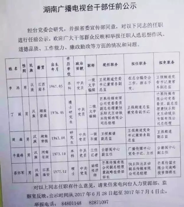 2017年6月28日,湖南广播电视台发布干部任前公示: