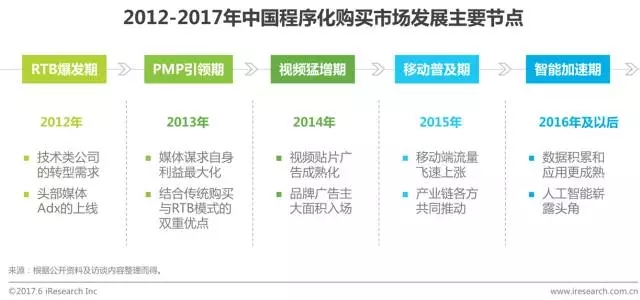自2012年“程序化元年”起,程序化购买在中国落地已有五年。五年间,程序化购买受到资本的热烈追捧,上百家程序化购买平台涌现,先后经历RTB爆发期、PMP引领期、视频猛增期、移动普及期等四个关键发展节点。程序化购买这五年的发展,极大地发挥了技术和数据在广告投放中的重要作用,有效地提升了网络广告投放的效率和效果。