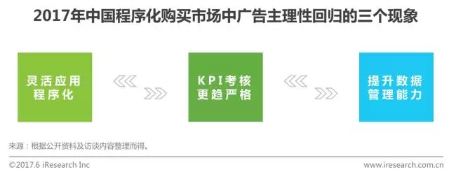 2016年,由于流量作弊、广告投放不透明等历史问题的累积和爆发,程序化购买市场出现了广告主不信任度增加、市场规模增速下滑等问题,这引起产业链上下游深入思考,程序化购买市场进入调整期。但是艾瑞分析认为,这次调整只是短暂的,技术和数据驱动数字营销大势不可阻挡,随着人工智能、区块链等技术的应用,程序化购买将进入智能加速发展期。