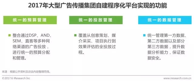 4A及本土大型广告传播集团希望通过自建的程序化广告平台实现统一的预算管理、投放管理和数据管理,然而,尽管部分4A公司在国外已有较为成熟技术和服务经验,但当前国内Trading Desk的应用进展仍然缓慢,这受到广告主认知程度低、国内媒体话语权大和数据开放意愿差等多种因素的制约。