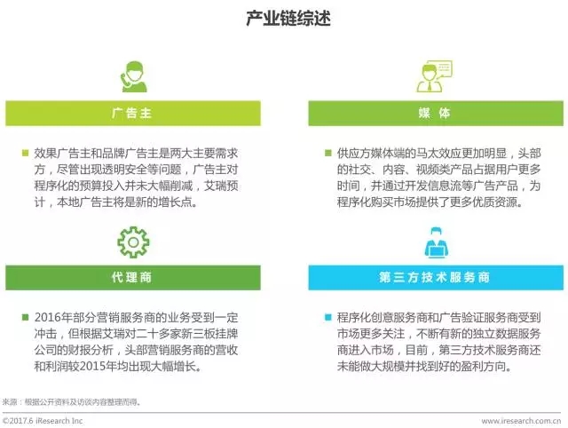 2016年9月1日,由国家工商行政管理总局公布的《互联网广告管理暂行办法》正式实行。在该暂行办法中,程序化购买首次进入监管视野,办法第十三、十四和十五条认可了程序化购买方式,并对程序化购买方式及产业链中广告需求方平台、媒介方平台和广告信息交换平台等主要角色的概念和义务做出了说明。艾瑞分析认为,这些规定实质上对程序化购买参与方设立了准入和参与门槛,通过对参与方主体的监管,解决过去市场中存在的权责不清等问题,程序化购买将由此逐步走向规范发展时代。