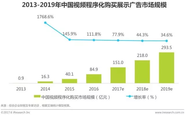 受广告主,尤其是品牌广告主对视频广告的需求快速增长以及媒体端大量视频广告资源的开放,视频程序化购买展示广告市场规模迅速增长,2016年市场规模为84.9亿,较2015年增长111.8%,未来三年仍将保持高速增长,预计到2019年,视频程序化购买市场规模将达293.5亿。
