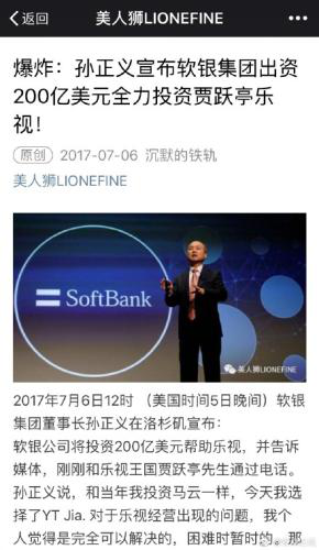 一家自媒体发文称:软银集团董事长孙正义在洛杉矶宣布,软银公司将投资200亿美元帮助乐视,并告诉媒体,刚刚和乐视王国贾跃亭先生通过电话。就此事情似乎有了转机。