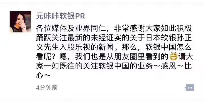 事出没多久,软银公司方面有内部员工就否认了此事。同时也很快被腾讯财经证实,乐视作出回应称,孙正义投资的新闻是假的,稍后会立即澄清,感谢关心。