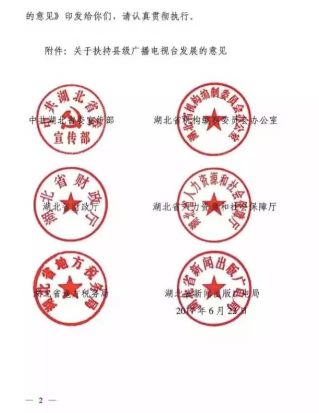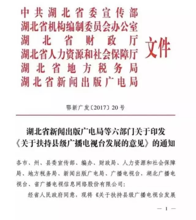 近日,为巩固基层宣传思想文化阵地、壮大主流思想舆论,推进县级广播电视台健康有序可持续发展,在深入基层调研、广泛征求意见的基础上,由湖北省新闻出版广电局牵头起草的《关于扶持县级广播电视台发展的意见》联合中共湖北省委宣传部、湖北省机构编制委员会办公室、湖北省财政厅、湖北省人力资源和社会保障厅、湖北省地方税务局正式印发。望结合工作实际,认真贯彻执行。