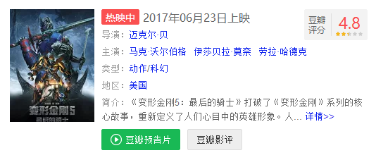 《变5》上映仅4天票房就已过9亿,位居中国影史第四,仅次于《速度与激情8》、《西游伏妖篇》和《速度与激情7》。截止日前,《变5》票房已经突破13亿,成绩力压碾印度高口碑影片《摔跤吧!爸爸》,尽管票房成绩表现良好,可豆瓣评分却仅有4.8,高票房低口碑的表现虽然有些对不起观众,但《变5》社交平台的“负面”话题影响仍为影片带来持续曝光,为影片传播略尽绵力。