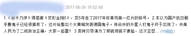 尽管官方前期传播噱头称《变5》请来9位编剧,阵容比《变4》多了近一倍,进而借此展开拉拢攻略表现出制作及开发方对《变形金刚》大IP的情怀与用心,但从目前美国票房早已扑街的现状来看,片方这套说辞似乎很难令观众买账,并且这一由头也致使观众认为《变5》口碑沦陷的原因全部归于“编剧太多、意见传达太散”等。