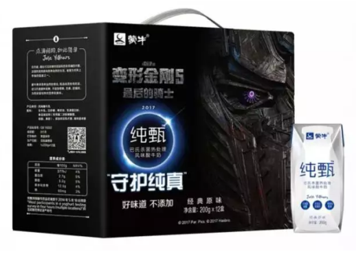 蒙牛纯甄不仅在影片植入内有所发声,线下也特别为《变形金刚5》定制了限量发售的特别版包装,以此呼应影片内的对立剧情——电影里,擎天柱和威震天两个经典角色分别代表正义和邪恶的一方,纯甄也为这两个角色定制了两版外箱包装,两箱拼在一起会有特别造型出现。