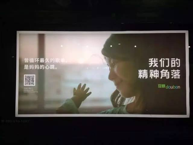 除了季度性的广告,一些商家也会在品牌达到一定成熟度之后选择添一把柴,借以巩固自己的行业地位。例如以文艺青年聚集地著称的豆瓣,首次入驻地铁广告就一副想要把情怀用尽的态势。“成立了十一年的豆瓣,终于做了一次广告。”仅仅这一句广告词就能直击资深用户的内心。