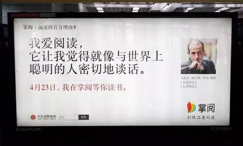 而在前不久的世界读书日,掌阅APP也在上地、西二旗等站投放了许多板块的广告,以名人爱阅读的形式鼓励大家读书,或者准确的说,鼓励大家下载APP。