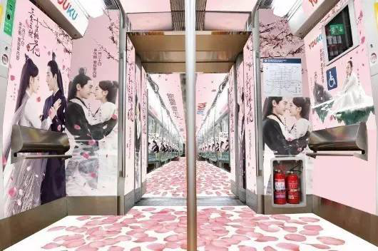 例如文章开头的绝味鸭脖,亦如海淀黄庄站的长幅小黄车广告。而前不久优酷为电视剧《三生三世十里桃花》造势投放的广告就更是霸占了整个西单地铁站,甚至颇有桃花林主题站的味道。
