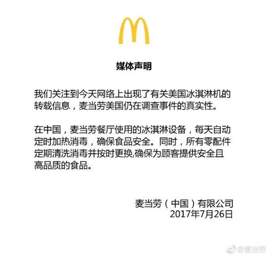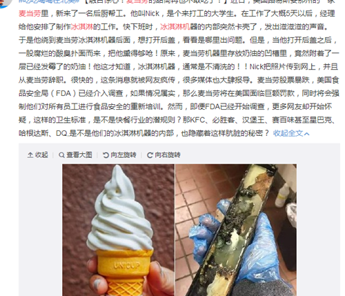 此前,一公众号发表文章,主要内容是一个名美国麦当劳前员工日前在推特上爆料称,麦当劳冰激凌机中的槽状零件严重发霉。他要求清理,却因此与经理争吵后,次日被开除。随后,这一消息被迅速传播,导致昨天晚间11点多,中国麦当劳官方微博发声,称与美方冰淇淋设备不同,并保证食品安全。