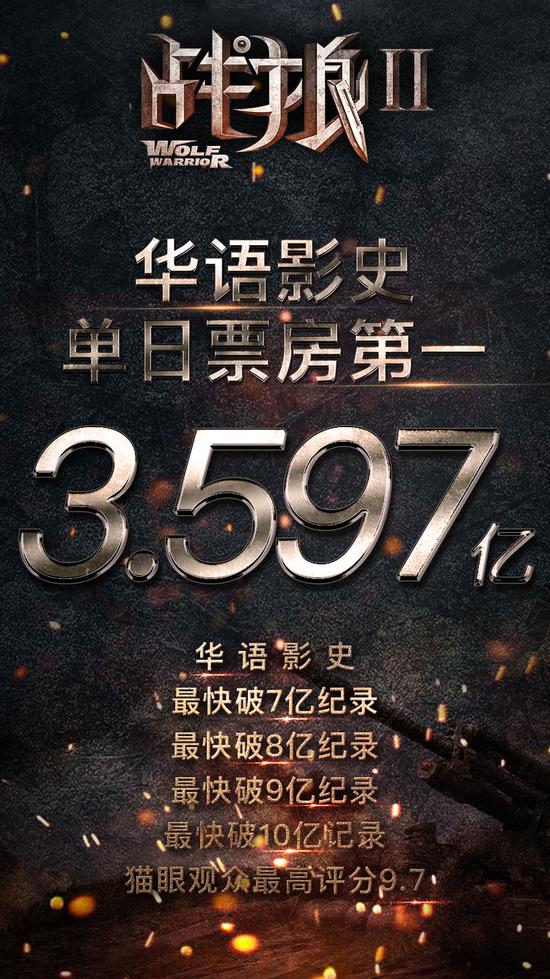 不太热的暑期档被《战狼2》烧到沸腾了!截至7月30日06:43,票房正式突破10亿,耗时83小时,创造华语影史“破10”新纪录。仅7月29日一天,就拿下3.597亿,刷新了华语影史单日票房第一的纪录。