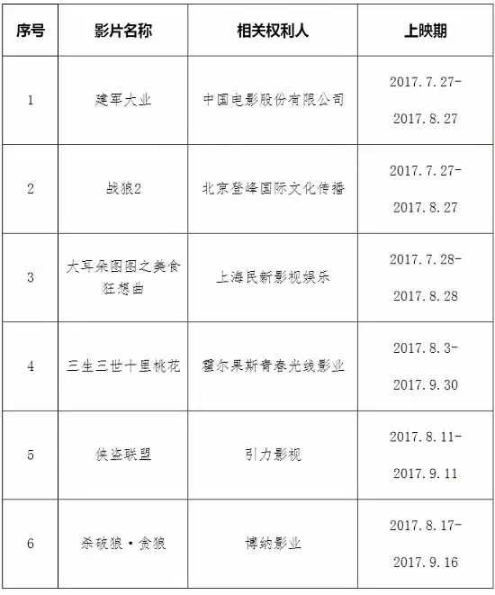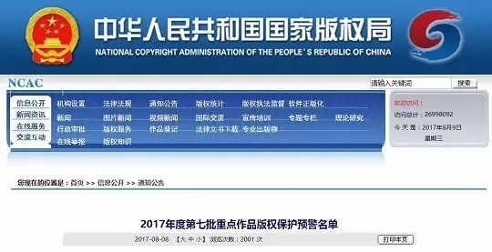 按照《国家版权局办公厅关于进一步加强互联网传播作品版权监管工作的意见》及国家版权局版权重点监管工作计划,根据电影相关权利人上报的作品授权情况,现公布2017年度第七批重点作品版权保护预警名单。