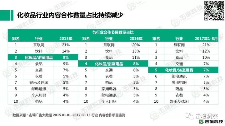 受媒体市场大环境的影响,广告主对于品牌宣传更加谨慎。在媒体的选择上开始逐步减少电视媒体,其中化妆品行业表现最为明显,电视内容合作项目数量逐年下滑。