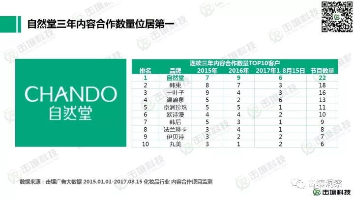 自然堂作为化妆品行业的电视内容合作大户,除三年电视媒体内容合作节目总数量位居第一外,在电视内容合作策略方面也越做越精。