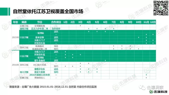 2015年、2016年自然堂以江苏卫视为“主战场”合作多档节目,横跨两年,同时增加湖南卫视、浙江卫视热点节目辅助曝光,牵手二线卫视,加大安徽卫视、深圳卫视内容合作,品牌下沉、延伸。