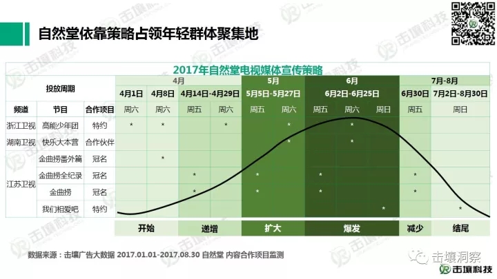从还原自然堂电视内容合作排期来看,2017年自然堂将内容合作策略做到极致,所有电视内容合作项目全部集中一线卫视,按照时间周期逐步推进项目合作,媒体宣传策略有效地提高自然堂品牌曝光度。