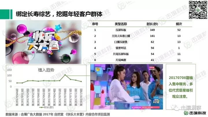 其次自然堂与湖南卫视《快乐大本营》的结合,借势王牌节目,提高品牌公信力,在每期常规植入的平稳曝光下,还为自然堂量身定制单期植入环节,利用明星效应再次吸引目标受众注意,扩大品牌曝光。