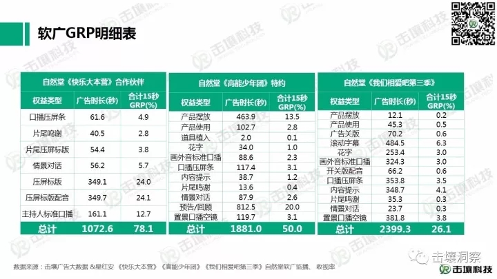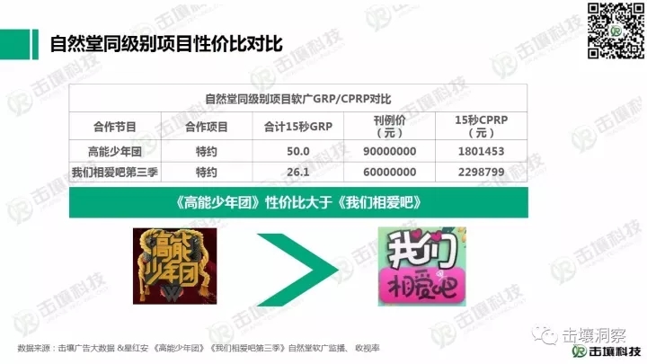 与同级别项目《高能少年团》特约权益相比,其自然堂的软广GRP也相对较低,性价比更不及《高能少年团》。