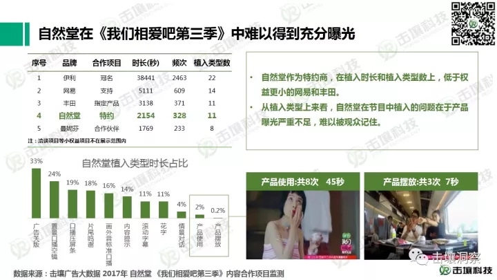 自然堂的传播策略值得大家学习,但整体植入展现效果来看,还需要很大的提升,尤其是在《金曲捞》和《我们相爱吧第三季》两档节目中。