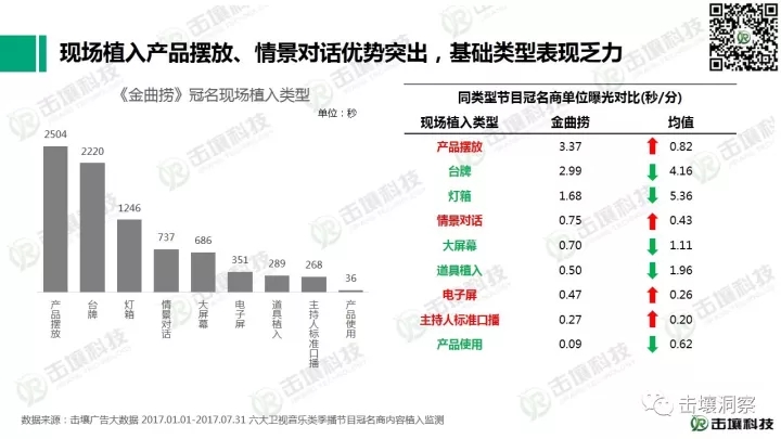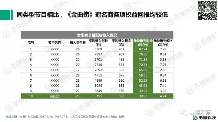 凭借“唤醒回忆与感动”等概念让《金曲捞》成为一时关注的焦点,但冠名商植入展现效果并不尽人意,与其它音乐类节目对比来看,《金曲捞》冠名权益并不出彩,各项权益回报相对较低,单位曝光时长位居倒数第一。在宣传爆发周期内,植入曝光效果不理想,拉低自然堂整体策略分值。