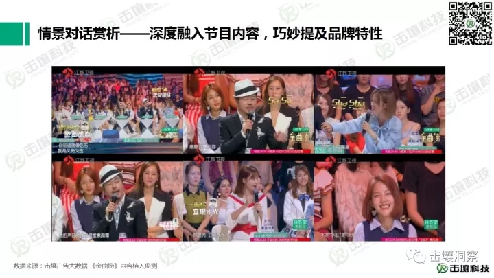 在现场植入上更多的展现以现场摆放和台牌为主,品牌曝光并不突出,后期嘉宾的情景对话互动增加,通过评论歌手声音特点,巧妙引到自然堂产品特性描述,并以幽默有趣的对话方式呈现,有效吸引观众注意。