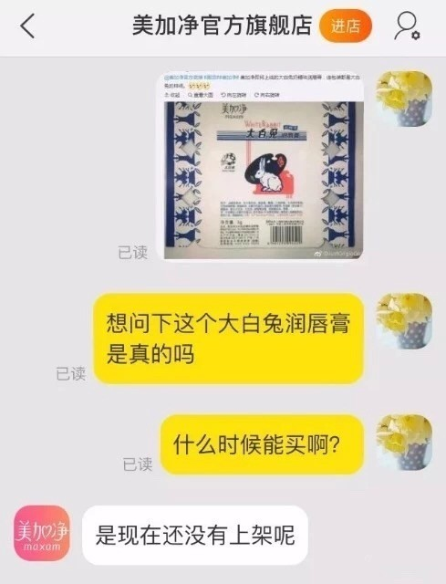 “谍照”信息一经流出,前来询问消费者的媒体络绎不绝,仅一天之内,就有数百人前往美加净天猫旗舰店询问客服润唇膏的上线时间等信息,许多网友摩拳擦掌表示已经等不及了要下单送给女友。
