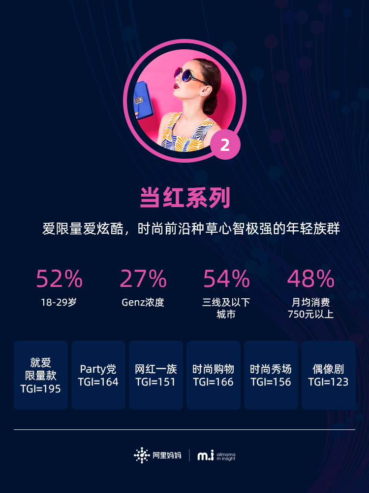 潮流当红系列网聚更多年轻族群,爱限量爱酷炫,追求时尚前沿。内容偏好偶像剧和秀场,喜欢网红的爱炫和自我。服饰风格上对潮流更敏感,更愿意为时下火热的风格买单。流量明星和青春偶像热剧更赢得他们的青睐。站外垂直潮流媒体种草,站内好物精选推荐。