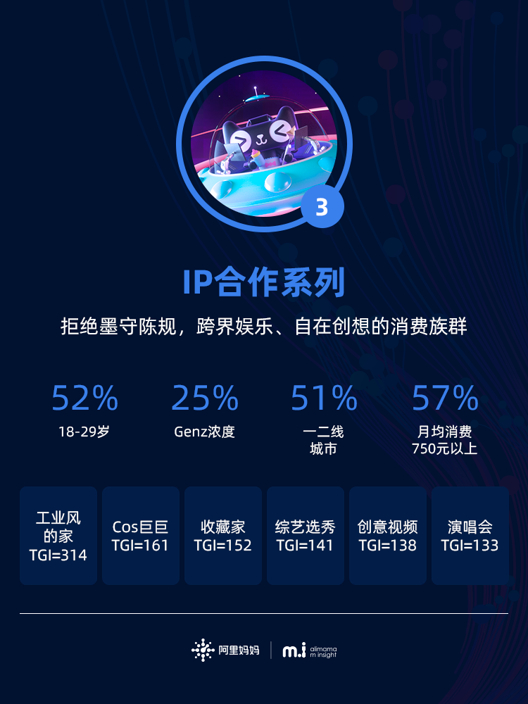 IP合作系列都市渗透力更强,聚集拒绝墨守陈规、跨界娱乐、自在创想的族群。喜欢工业风家居和收藏的格调小众生活风格,内容偏爱综艺选秀、演唱会和创意视频。服饰风格偏好古着风和文艺跨界,对经典文创跨界联乘关注度高。站外社交话题和二次元破圈,站内直播流量收割,重视校园季、出游等日常节点心智。